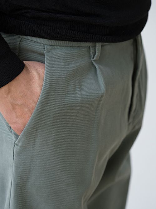1プリーツのリラックスフィットモデルBLEECKER、カーキのテンセル×コットン素材を使用した一着。