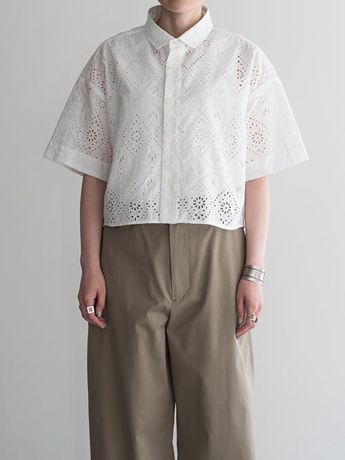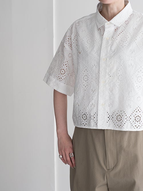 繊細なカットワークレースが涼しげな印象を与えるショートスリーブシャツ。コンパクトな丈感なので、ワイドパンツやボリュームのあるボトムと合わせることでバランスの良い大人カジュアルが完成します。