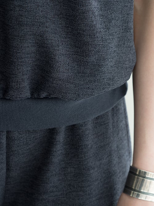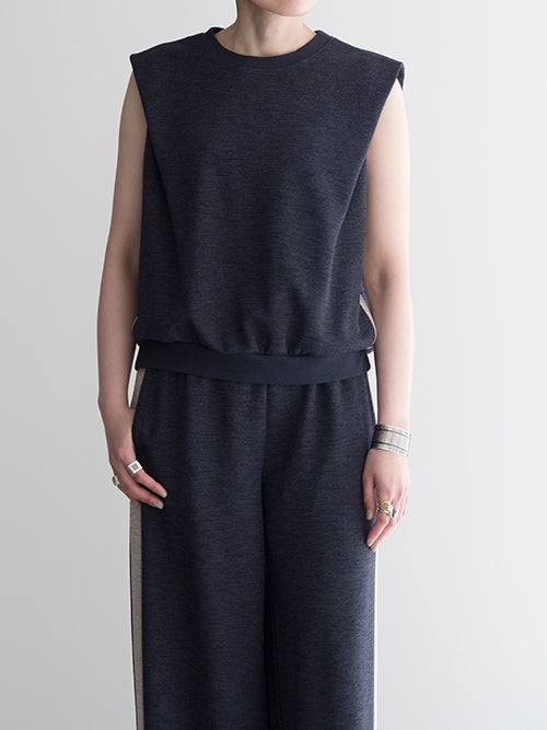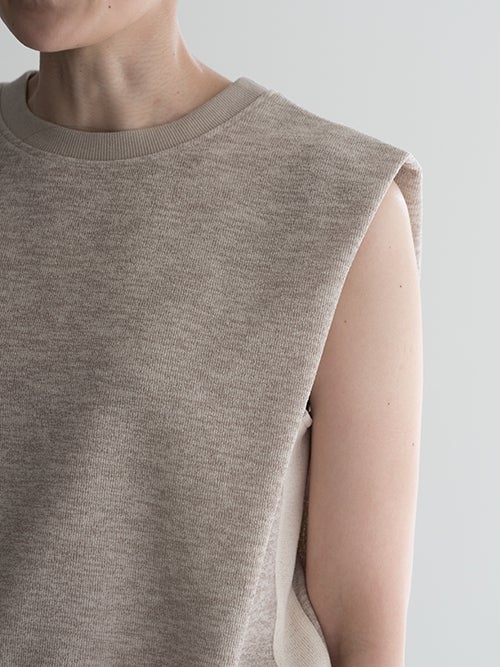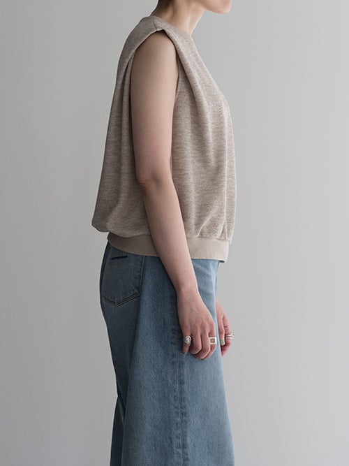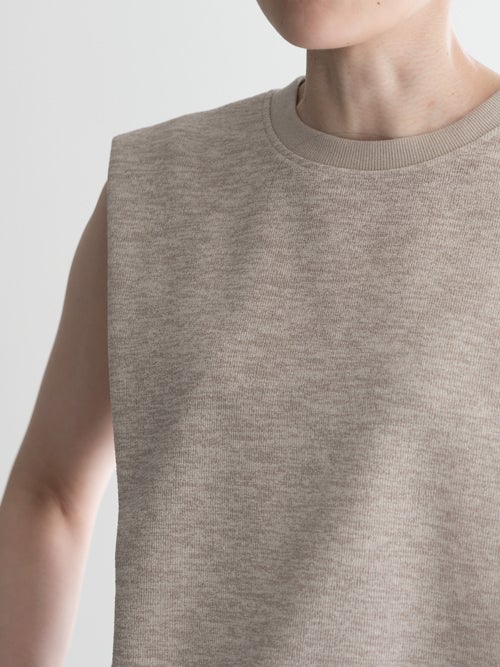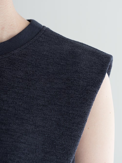 立体感があり肩に少しかかるデザインが腕まわりをすっきり見せ、ショルダーデザインが目を引くノースリーブトップス。程よくハリのある柔らかな素材が美しいシルエットを生み、シンプルながらも存在感のある一着です。