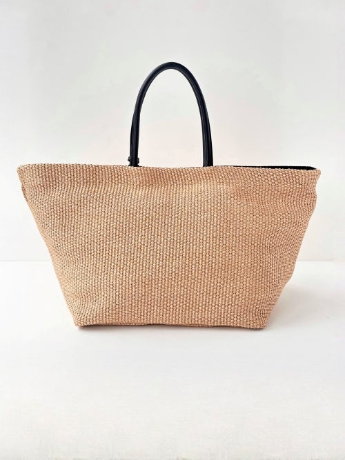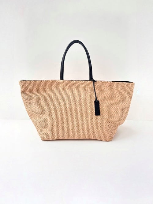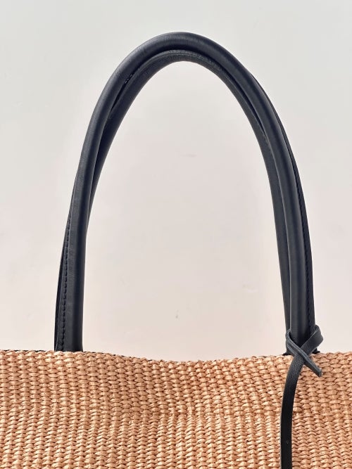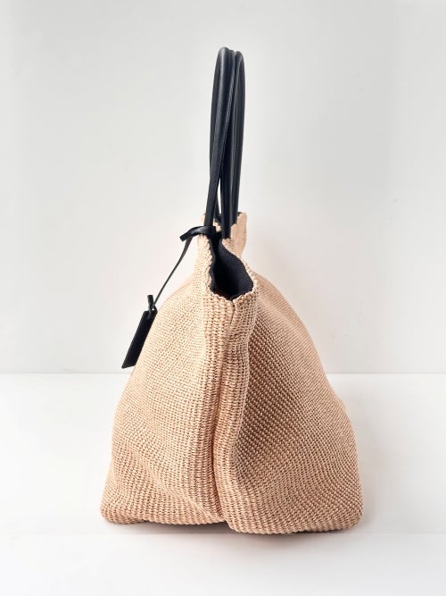 その存在感のあるサイズを活かし、ワイドパンツやロングワンピースなどリラックス感のあるスタイリングに合わせるのが今季の気分。バッグのハンドルがブラックのカーフレザーなので足元も黒のトングサンダルやミュールで色を拾うと、全体のトーンが美しく整います。
