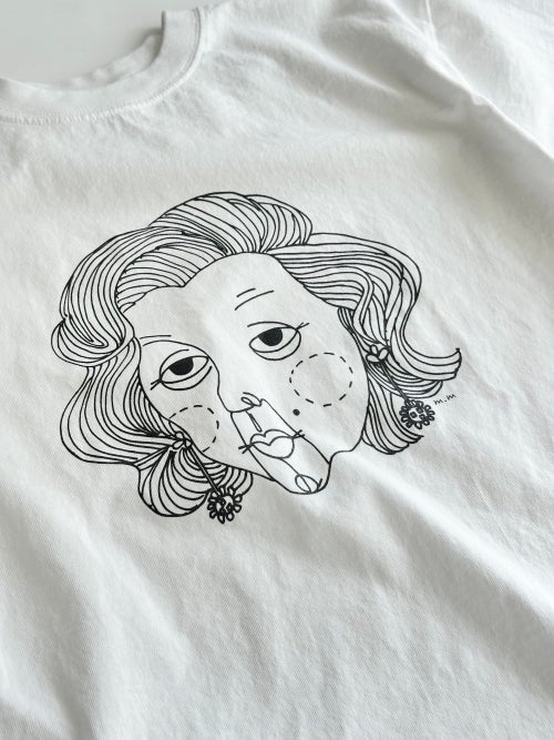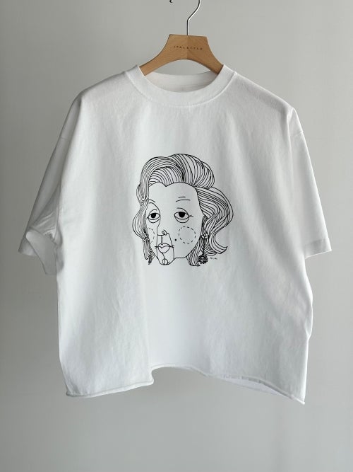 クリーンなホワイトボディに、印象的なフェイスラインアートをあしらったデザインTシャツ。柔らかなコットン素材で快適な着心地を実現し、程よくゆとりのあるシルエットが大人の抜け感を演出します。