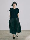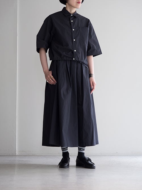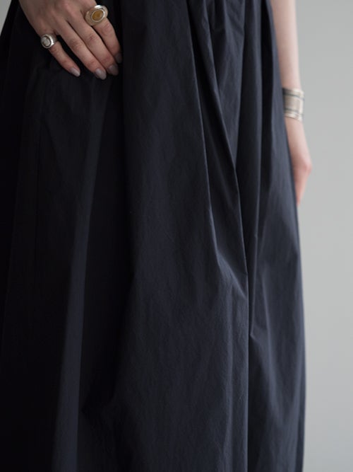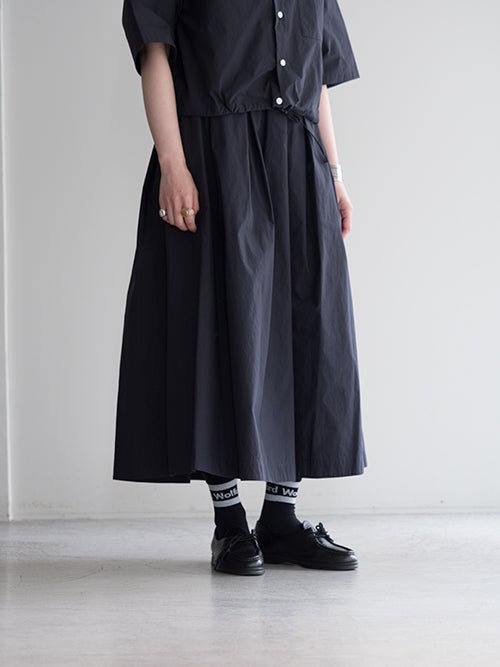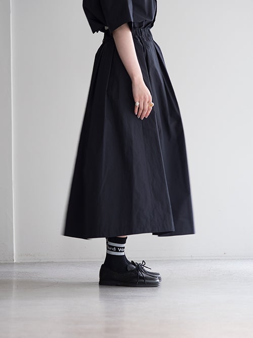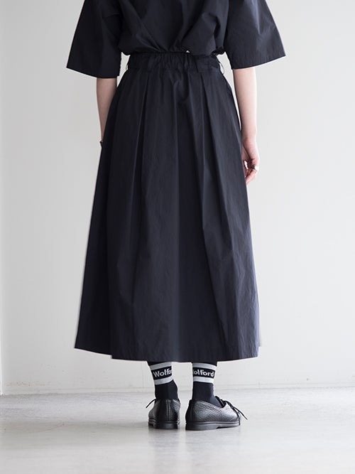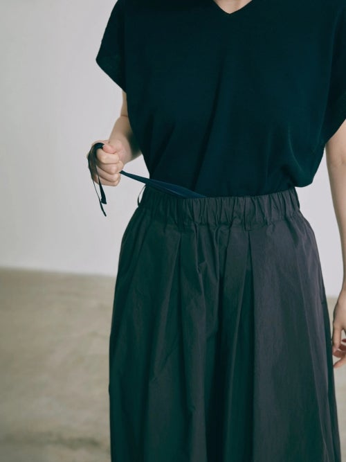 たっぷりと施したタックが生み出す立体的なAラインシルエットが印象的で動くたびに美しく揺れる一着。ウエストはゴム仕様にドローストリングを備え、快適なフィット感を実現。足首まで届くロング丈で大人らしい上品さを引き立てます。
