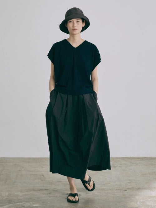 コンパクトなトップスやノースリーブと合わせることで、スカートのボリューム感を活かしたメリハリのあるスタイリングに。シンプルなカットソーをタックインするだけでも洗練された印象に仕上がります。