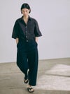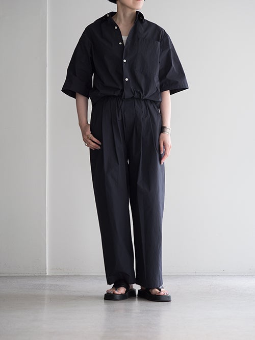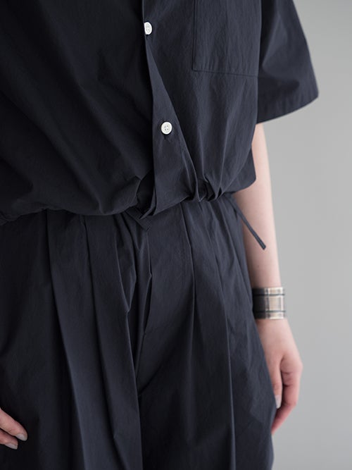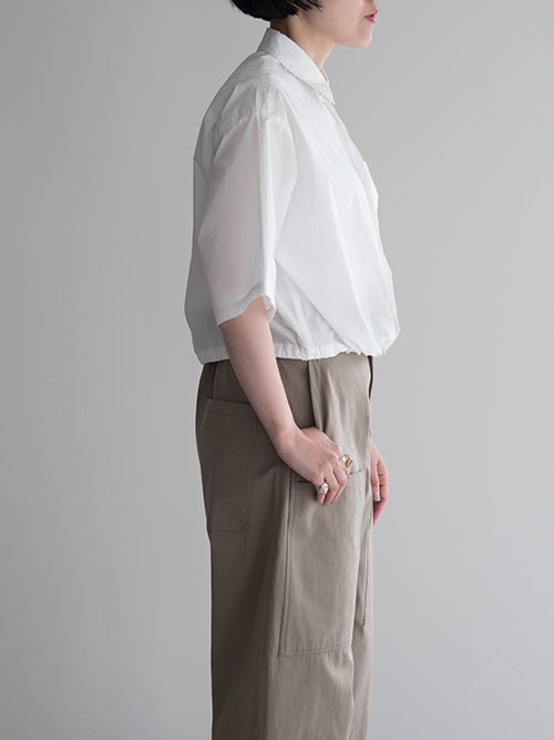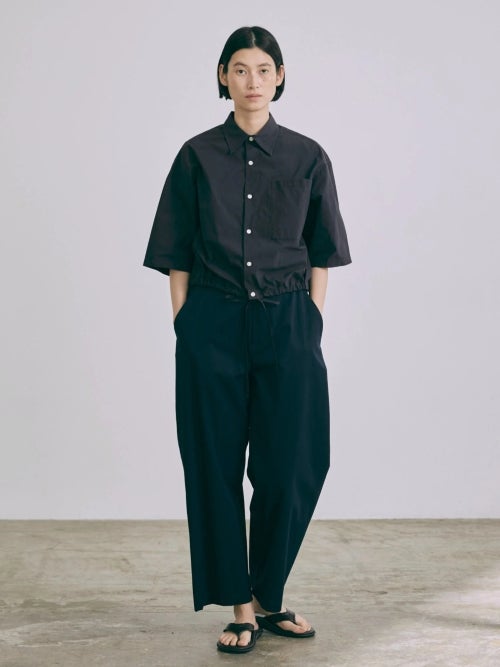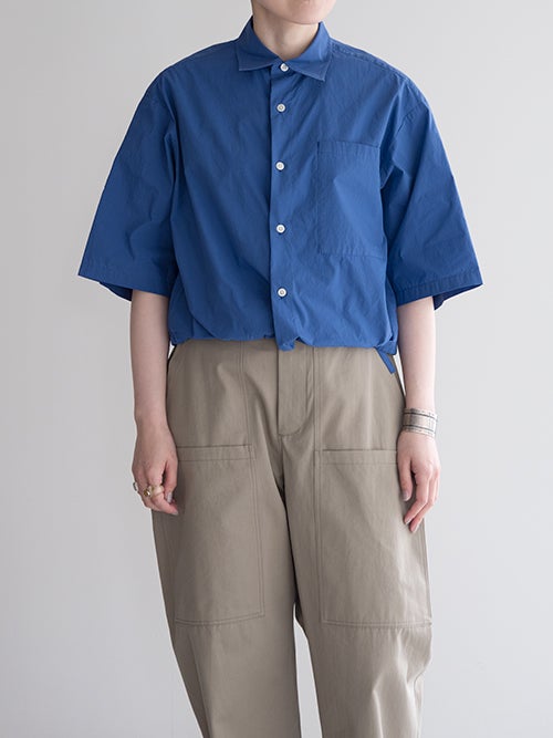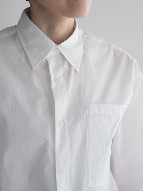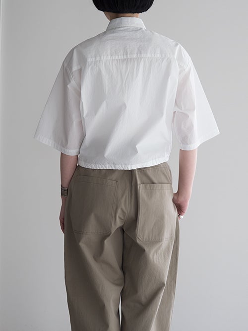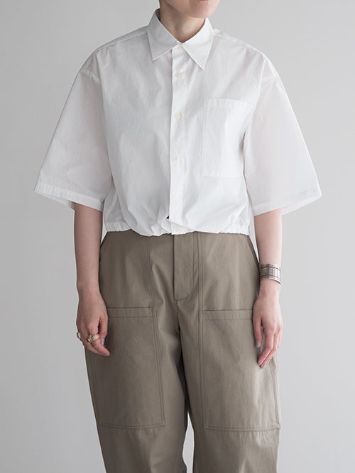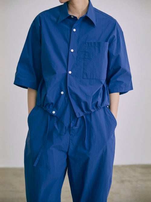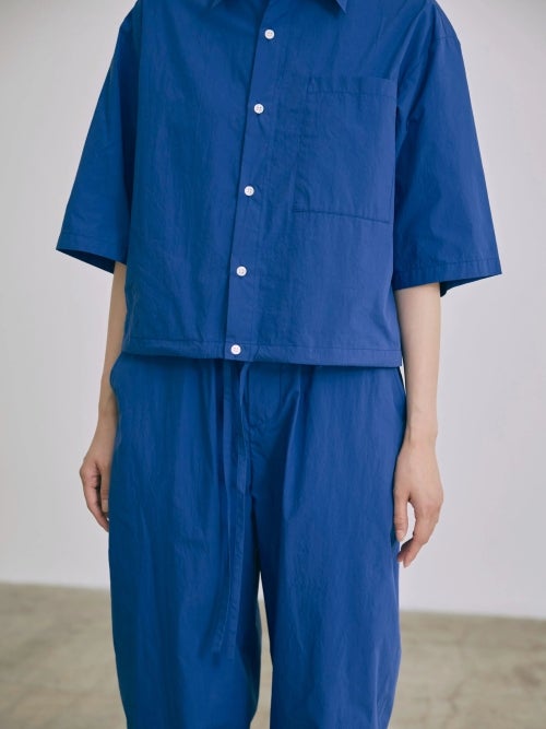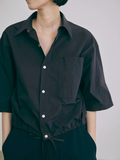 タテ糸にナイロン、ヨコ糸に綿を高密度に織り上げたオリジナル素材を使用。軽やかでさらりとした肌触りが特徴の春夏に最適な一着です。ベーシックなシャツをショート丈にアレンジし、程よくゆとりのあるシルエットで大人のリラックス感を表現。