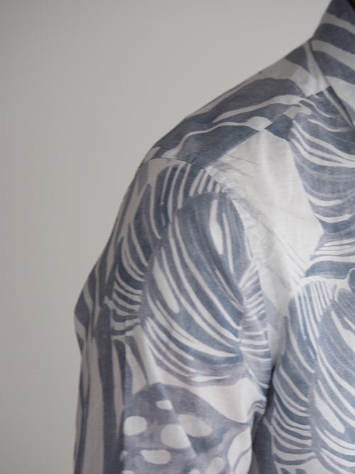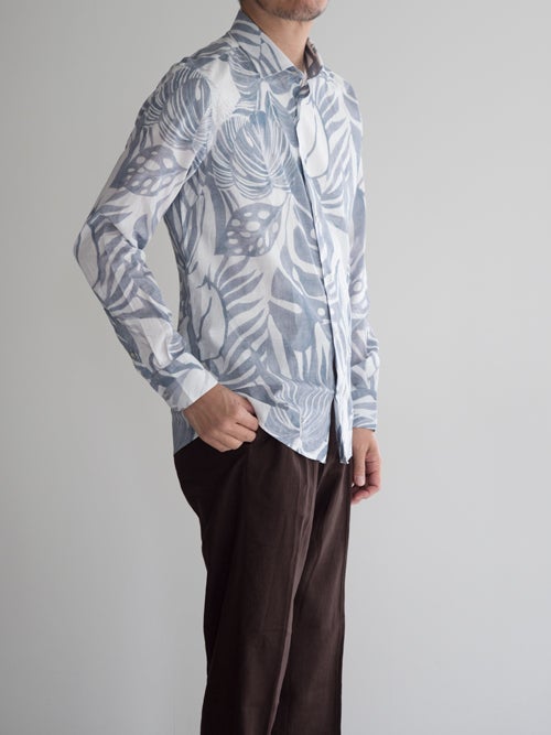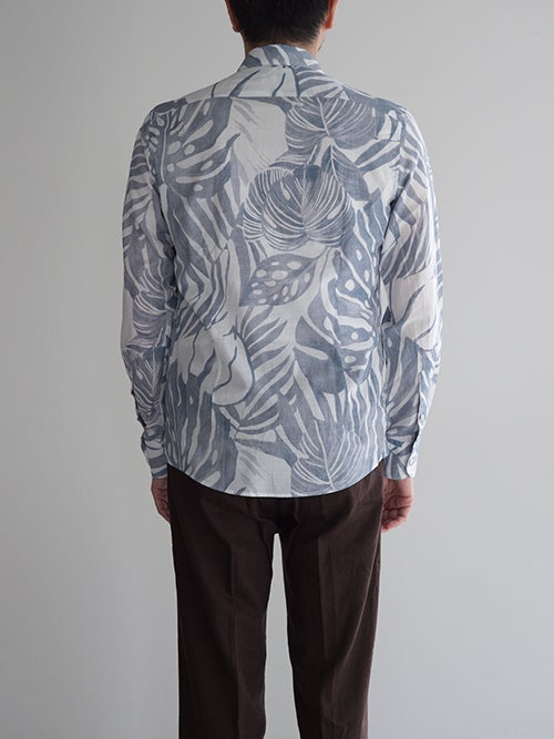 総柄にも関わらず、どこか落ち着いた印象に見えるのはカラートーンの妙。インパクトがありながらも、派手過ぎないバランス感覚が魅力的な一着です。