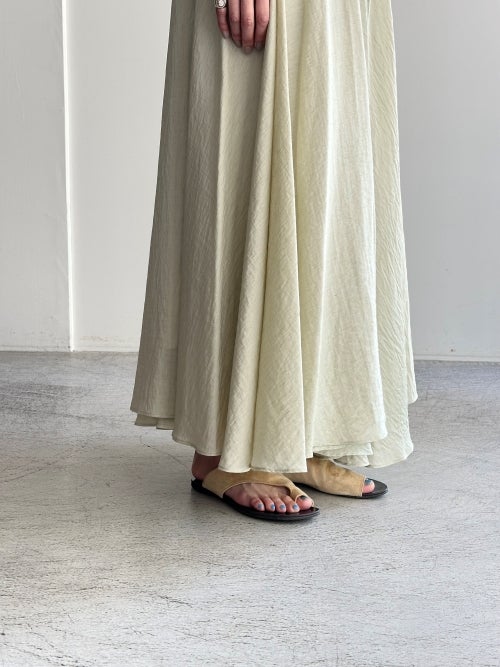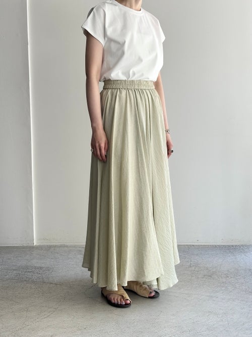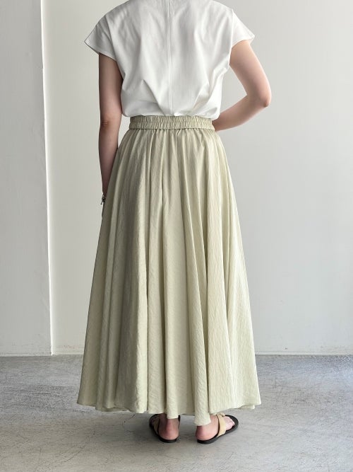 贅沢に生地を使用したボリュームシルエットながら、リネン混ならではの軽やかさで重たさを感じさせません。ナチュラルなシボ感と程よい光沢が、大人の余裕を感じさせる洗練された表情を作り出します。