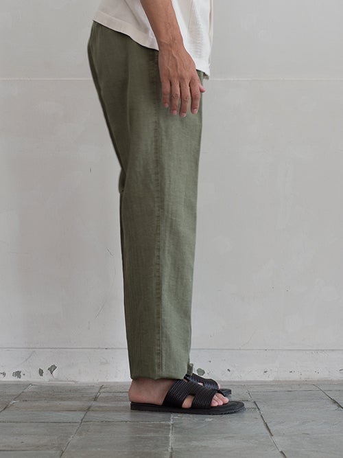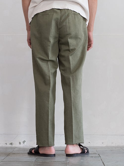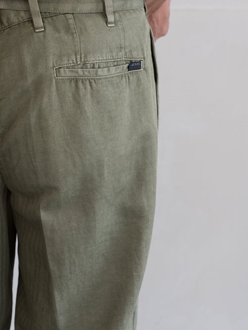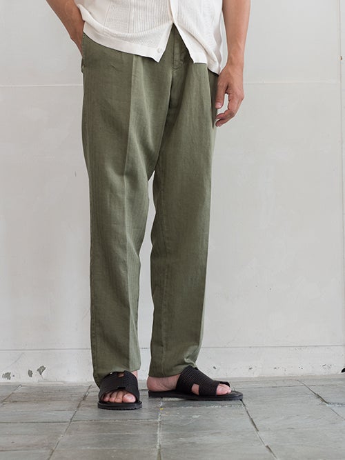 ベルト付リラックスフィットパンツFRANK、コットン×リネン素材を使用したカーキカラーの一着。