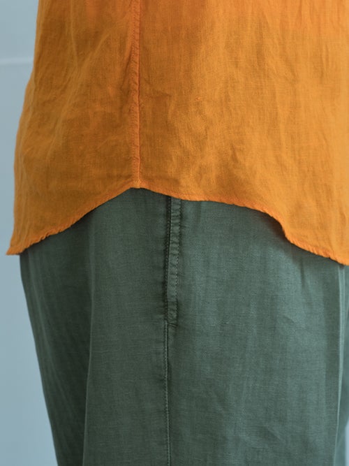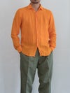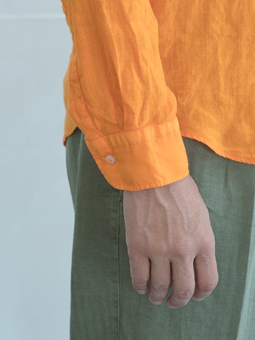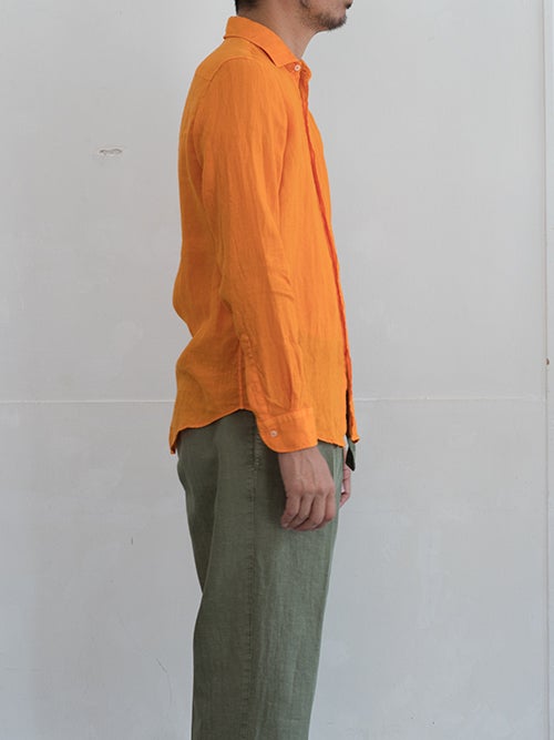 定番のレギュラーカラーシャツ、オレンジカラーのリネン素材を使用した一着。
