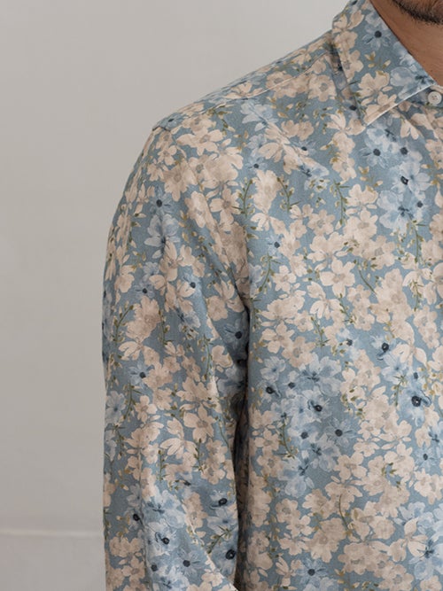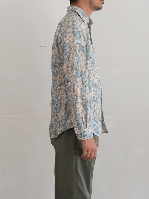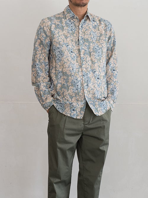 定番のレギュラーカラーシャツ、サックスブルーのフラワープリント素材を使用した一着。