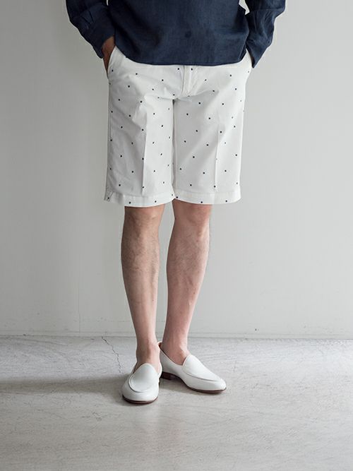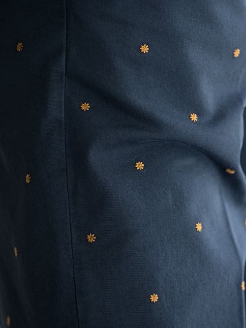 小花の刺繍を散りばめたコットンショートパンツ。ストレッチのきいた快適な着用感です。