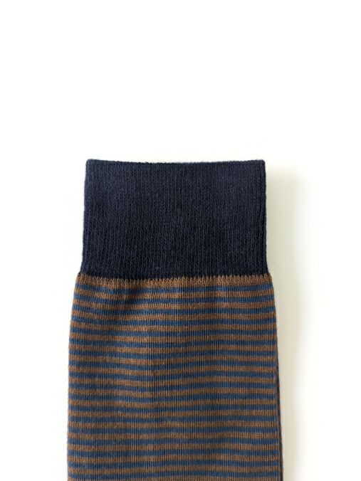コットンナイロン混のソックス。ストレッチも効いていて快適な着用感です。ブラウンとネイビーのボーダー柄は、キャッチーさと落ち着いた雰囲気を併せ持った上品な一足です。