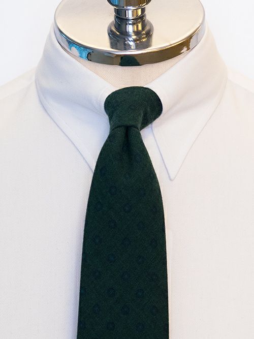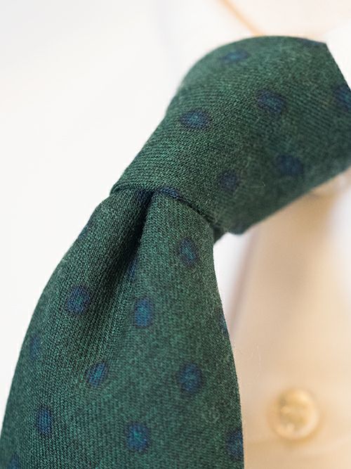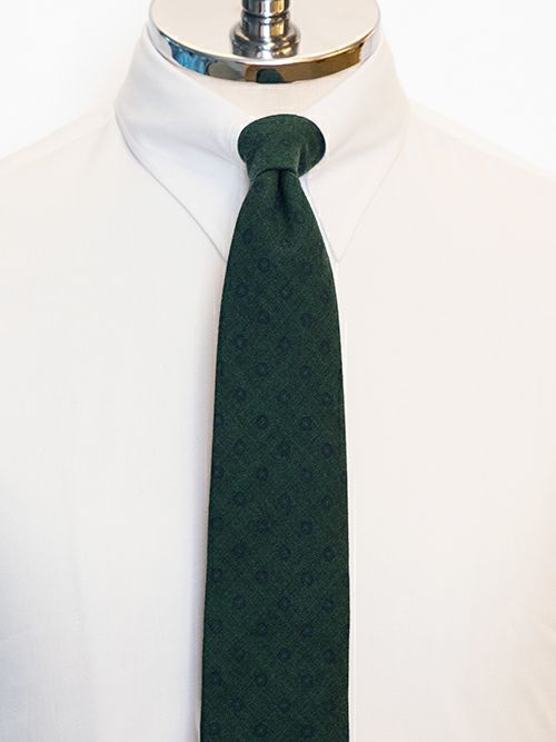 ウール素材のハリ感ある小紋柄ネクタイは、ヴィンテージ調の落ち着いた発色のグリーンが美しく、上品なVゾーンを演出できます。