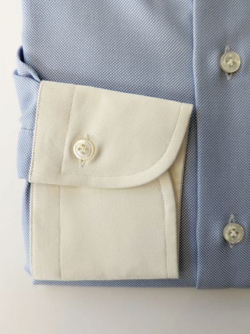 通常量産のシャツでは、生産効率のため脇縫いから袖先まで一気に縫い上げる物がほとんどですが、腕の運動量を考えた上、袖パーツを後付けし、より立体的に作り込んでいます。