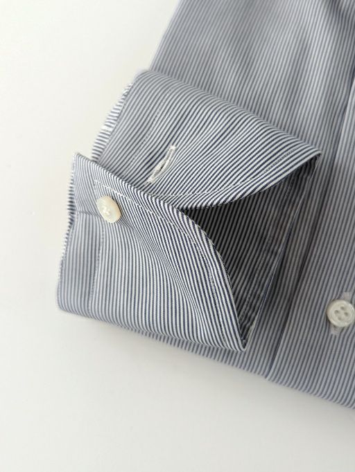 通常量産のシャツでは、生産効率のため脇縫いから袖先まで一気に縫い上げる物がほとんどですが、腕の運動量を考えた上、袖パーツを後付けし、より立体的に作り込んでいます。