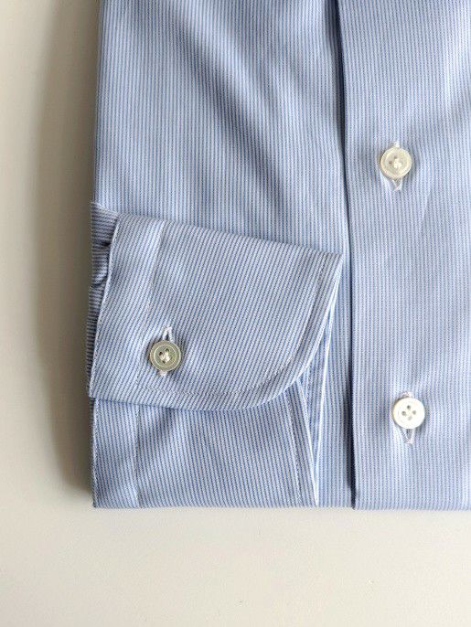 通常量産のシャツでは、生産効率のため脇縫いから袖先まで一気に縫い上げる物がほとんどですが、腕の運動量を考えた上、袖パーツを後付けし、より立体的に作り込んでいます。