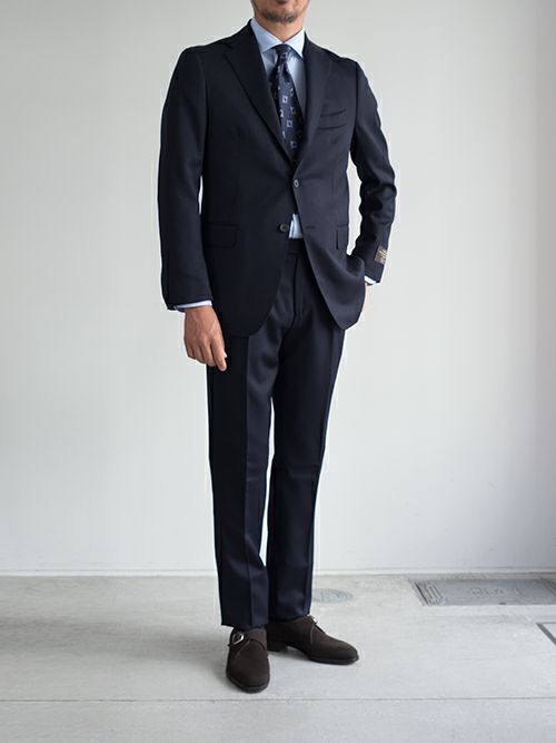 イタリア生地のVITALE BARBERIS CANONICO(ヴィターレ バルベリス カノニコ)の生地を使用した秋冬スーツ。タイドアップや、インナーにニットと合わせるなど、幅広く着用いただけます。ジャケットはノッチドラペル、フラップポケットで3つボタンの段返り仕様。毛芯には本バス毛芯(馬の尾毛)を使用し、衿元から胸にかけてハリを与え立体的なシルエットをになります。毛芯の中でも最高峰の物を使用しております。 肩から首にかけて吸い付くような、のぼりをぜひご体感ください。