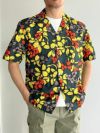 力強い色彩で描かれたイエロー・レッド・ブラウンの花柄が、ブラックベースに映えるインパクト抜群のデザイン。軽やかでハリ感のあるコットン素材を使用し、涼しげな着心地も魅力です。フロントボタンを開けて羽織としても使える万能アイテムで、夏のスタイルにアクセントをプラスしてくれます。