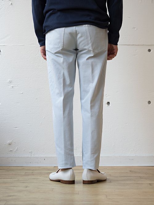 細すぎない適度なストレートシルエットが魅力的。これからのシーズンに最適なサックスブルー、ソフトタッチなストレッチ素材で、履き心地にも優れた一着です。