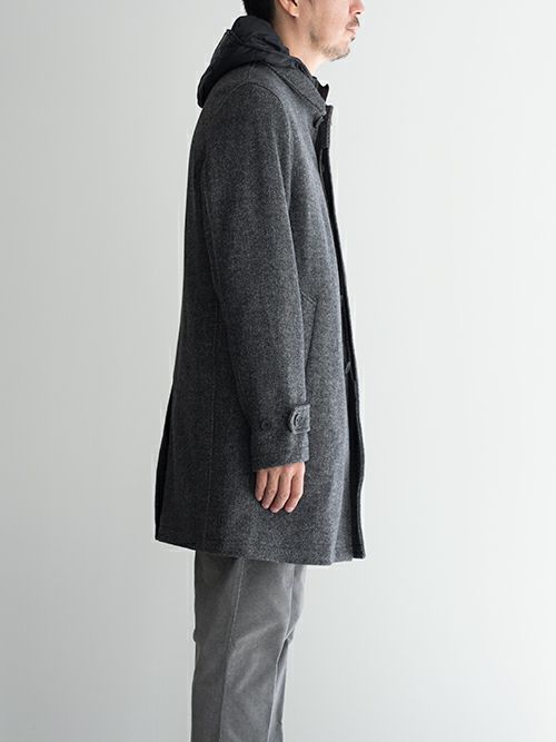 前立て部分が着脱可能なライナーが付いたウール混素材のコート。保温性の調節だけでなく、フードの有無でコーディネートの幅が広がる一着です。