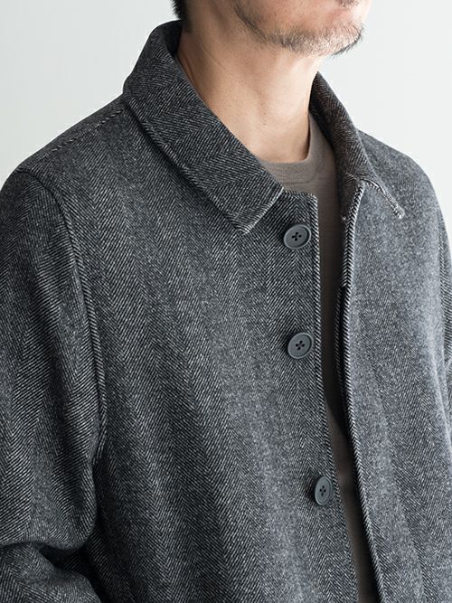 フロント釦は比翼になっており、スタイリッシュな見映え。そして、ヘリンボーンのクラシックな表情と、スポーティな機能面を兼ね備えた万能コートです。