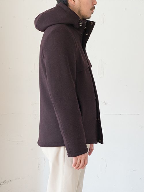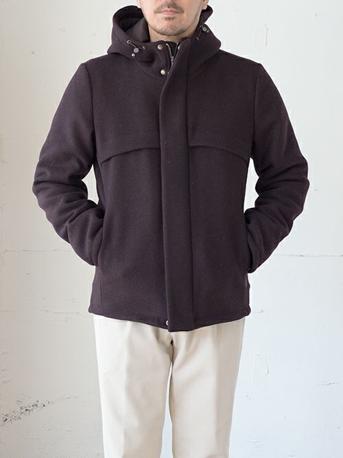 ウール×レーヨン素材のフーディアウター、高機能の中綿を使用した一着です。