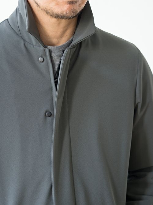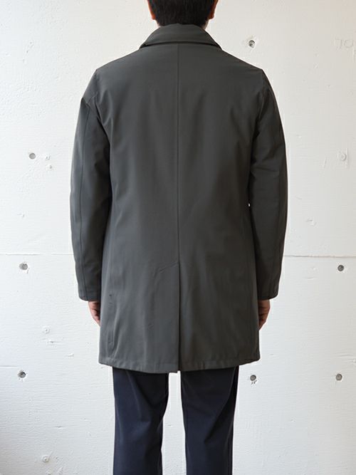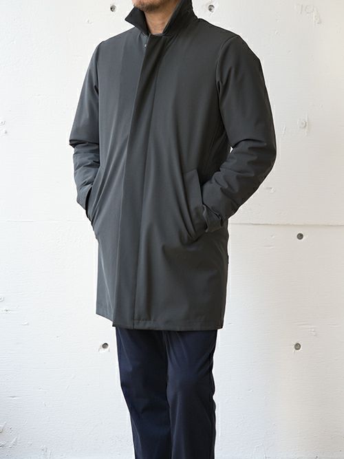 止水ファスナーや中綿ライナー仕様のステンカラーコート、高機能の中綿を使用した一着です。