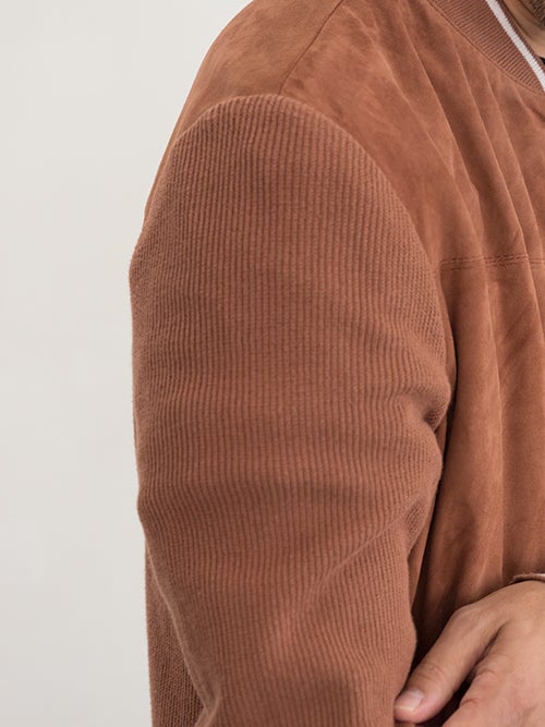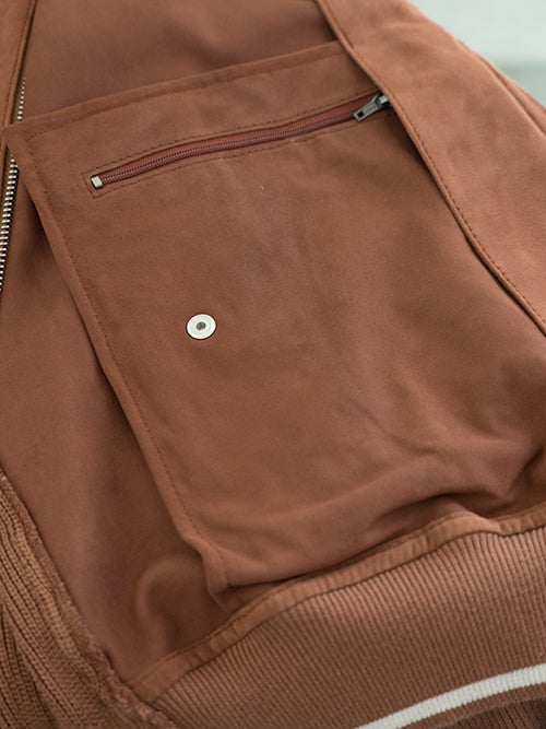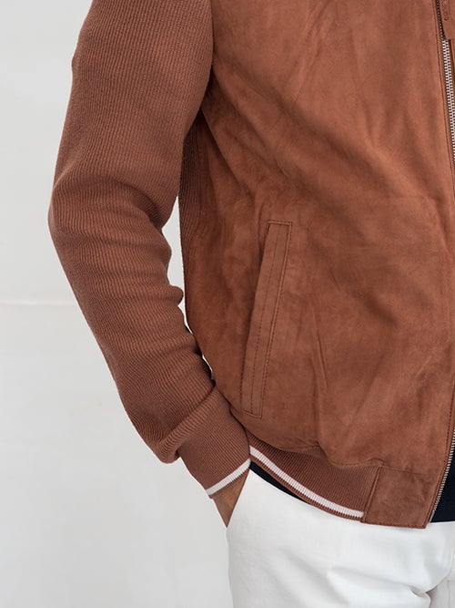 スウェード×リブニットのコンビブルゾンモデルBASEL、ボルドーカラーのシープスェードを使用したスポーティーなデザインの一着。