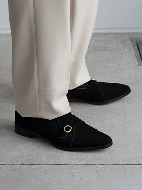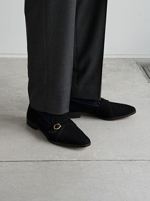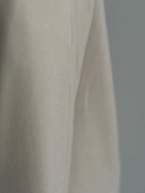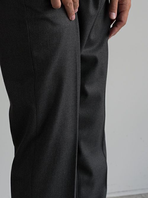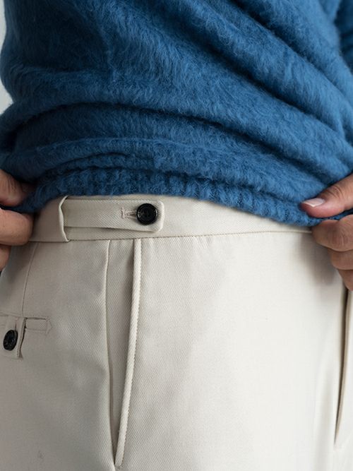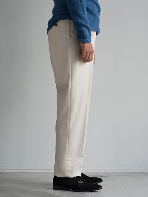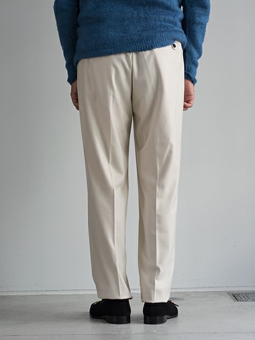 ノータックで腰回りはすっきりと見せ、裾に向かって緩やかにテーパードした上品なシルエットの一着。ウエスト両サイドはアジャスト仕様になっており、サイズの微調整が可能です。