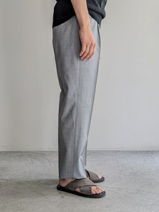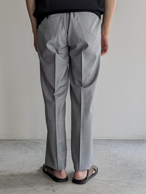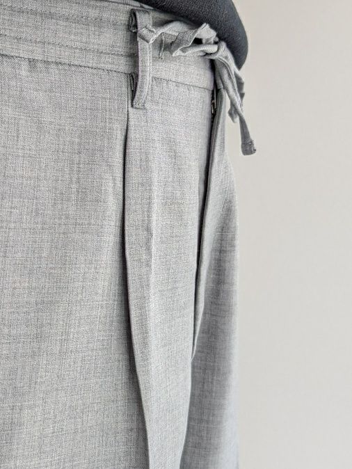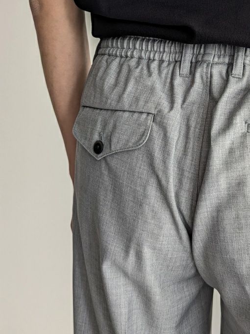 ウール、ポリエステル混生地のイージーパンツ。ウエストは背面がシャーリング仕様になっており、フロント内側にドローコードを配しています。