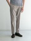 ウールとポリエステル生地のワンプリーツスラックス。ウエストはドローコードが付いており、後ろはゴム仕様ですので、程よく腰回りにゆとりがあります。