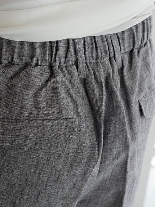 リネン生地のワンプリーツパンツ。ウエスト後ろはゴム仕様ですので、程よく腰回りにゆとりがあります。