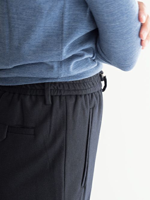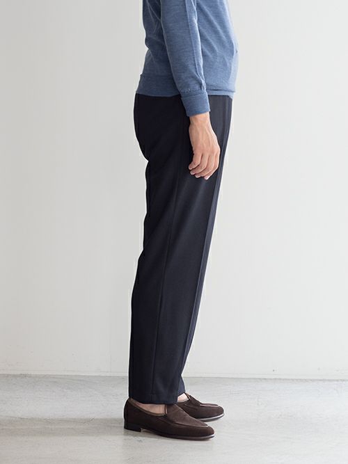 ウール、ポリエステル、レーヨン生地を使用したノータックパンツ。全体的にゆとりのあるテーパードシルエットです。ウエストはシャーリング仕様になっており、サイズの微調整が可能。今のトレンドを上品に取り入れた大人のイージーパンツです。