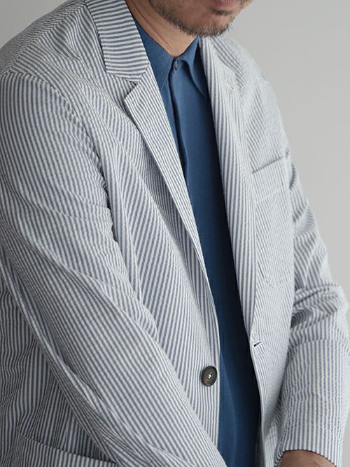 春夏シーズンに適したシアサッカー生地を使用したシングル2つ釦ジャケット。裏地なしの軽やかな着用感です。