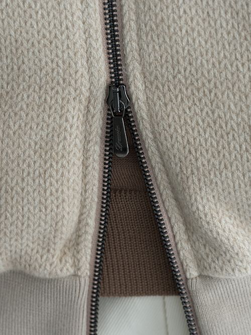 ウール、シルク、カシミヤ三者混のニットフーディ。見た目の高級感もさることながら、ダブルジップ仕様、サイドポケット完備、裏地付きによる防風性と着脱のし易さなど、実用性の高さも魅力的な一着です。