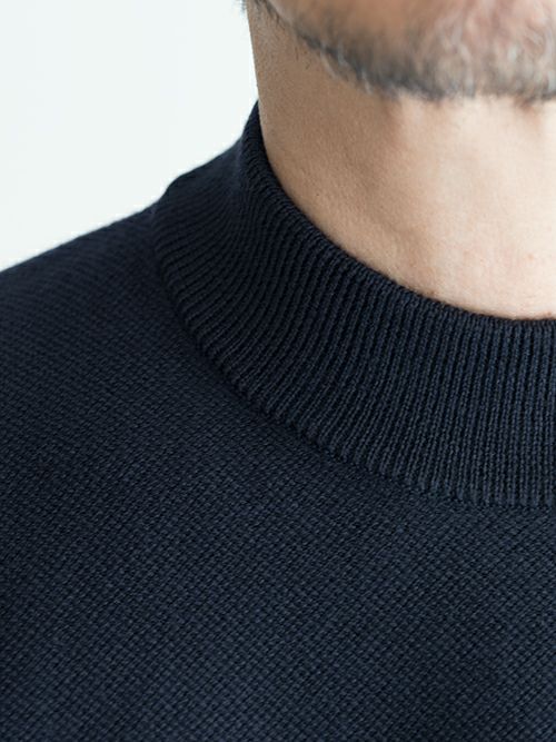 鹿の子編みのウール100%モックネックニット。首元裏にボーダー柄をあしらっており、見えない部分にも遊び心を感じます。