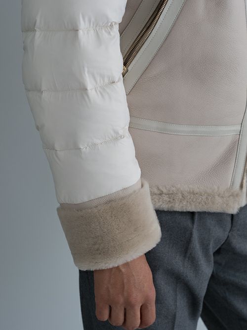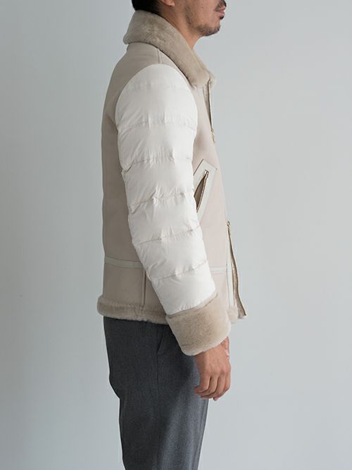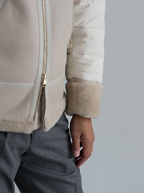 身頃がムートン、アームがダウンを詰めたナイロン袖になったモデルHOLT。デザイン性と保温性を兼ね備えた他にはない特別な一着です。