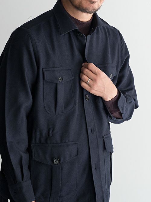 気軽に羽織る事ができて保温性にも優れた、ウール素材のシャツジャケット。良い意味でナポリらしさが表に出ず、モダンなデザインと上品な雰囲気が魅力的です。ミリタリーを基調としたディテールも好印象、且つ機能的。内側に配したドローコードはシルエットの調整を可能にし、動きのあるスタイリングを楽しめる一着です。秋の羽織り物としてだけでなく、冬場にはアウターのインナーとしても活躍してくれます。