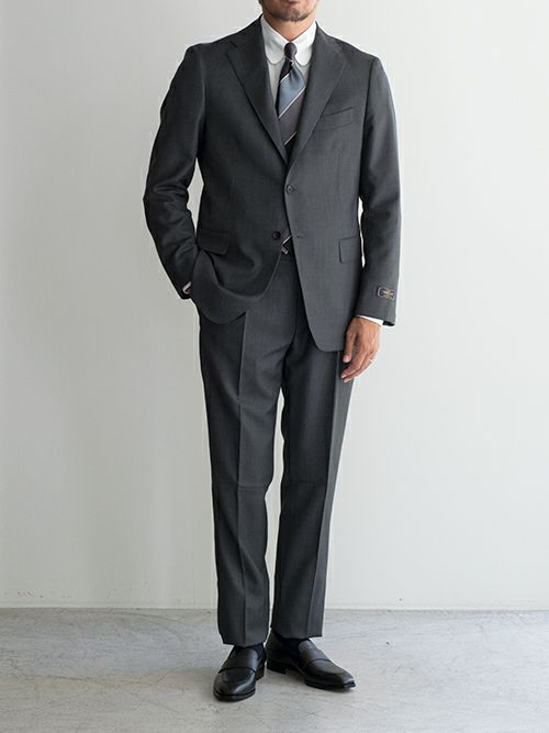 ジャケットはノッチドラペル、フラップポケットで3つボタンの段返り、総裏地仕様。毛芯には本バス毛芯(馬の尾毛)を使用し、衿元から胸にかけてハリを与え立体的なシルエットをになります。毛芯の中でも最高峰の物を使用しております。