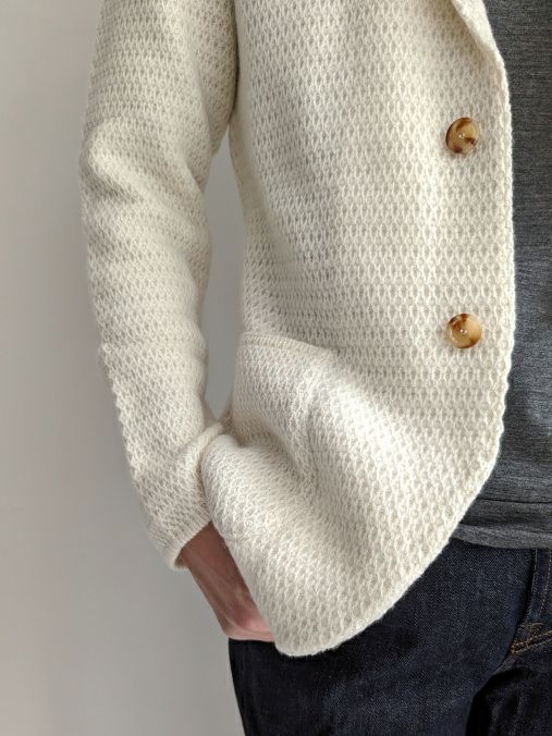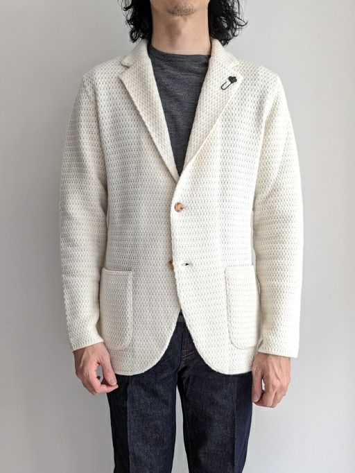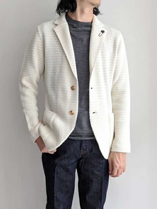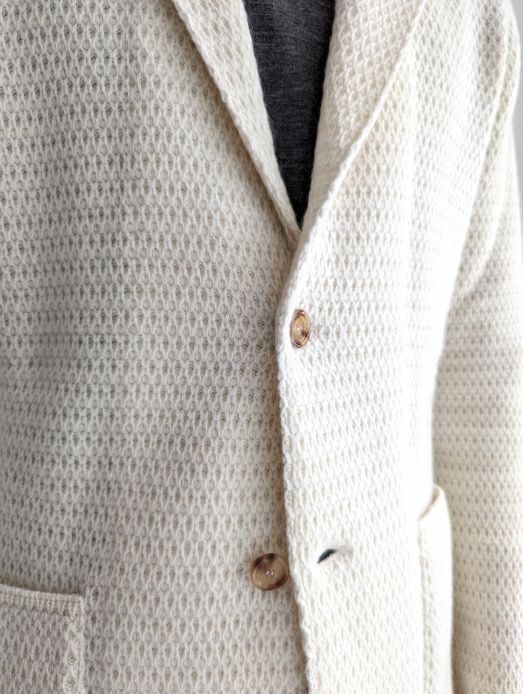 ノッチドラペルにフロントのパッチポケット、袖と背共に裏地はなしのカジュアルなデザイン。シンプルであるが故にカシミヤ100%の生地と、上質な仕立てが際立っており、ブランドアイコンでもあるブートニエールがその名の通り花を添えます。