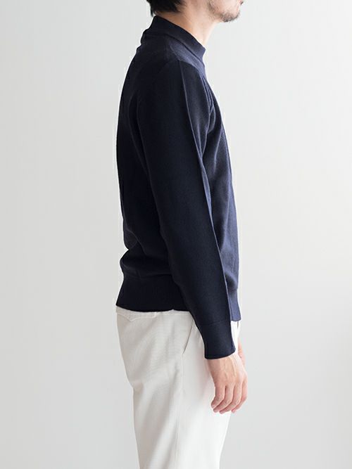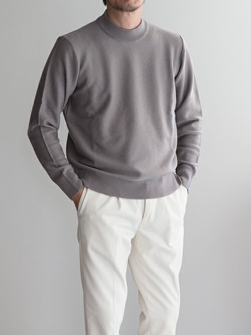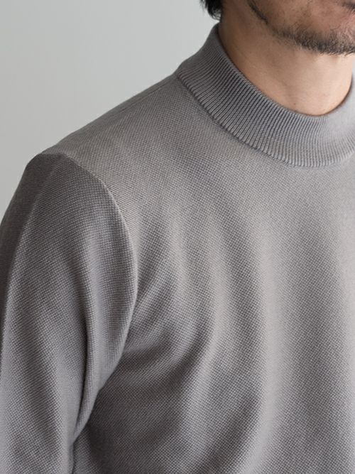 鹿の子編みのウール100%モックネックニット。首元裏にボーダー柄をあしらっており、見えない部分にも遊び心を感じます。
