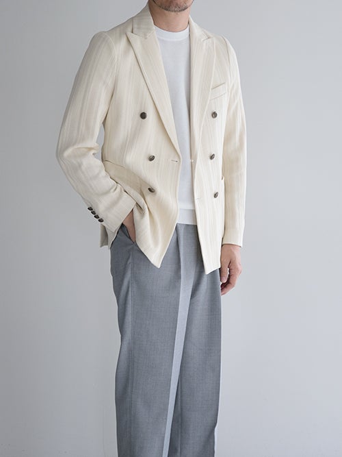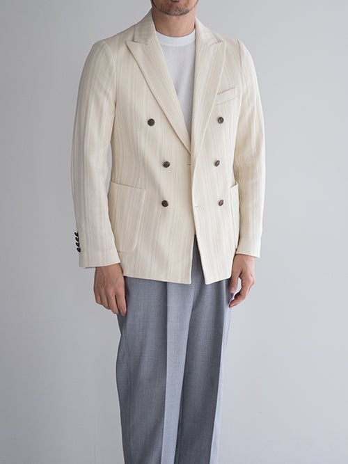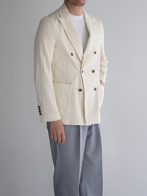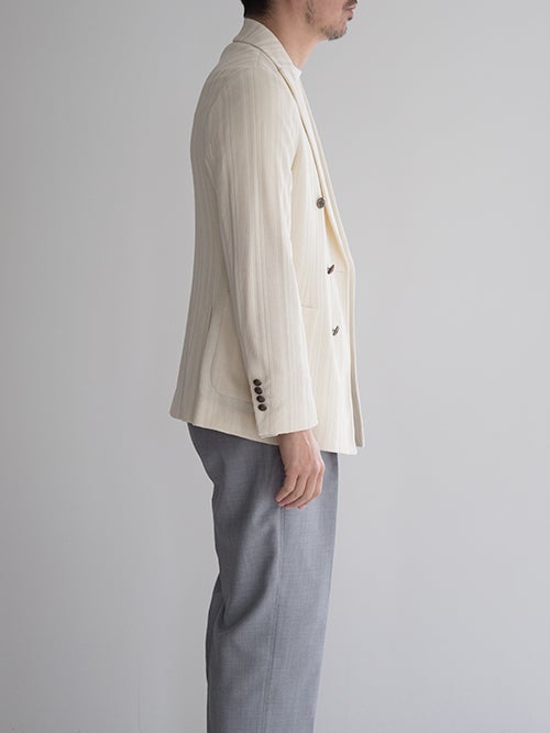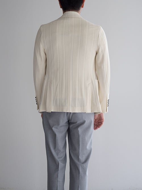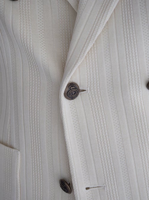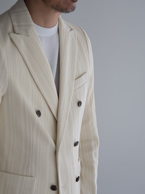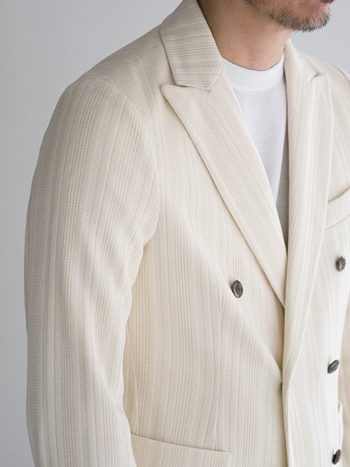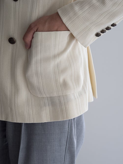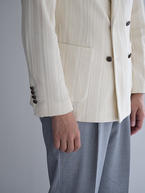 ピークドラペル・パッチポケット・サイドベンツ仕様。編地で表現されたストライプ柄が仄かなアクセントになる一着です。。