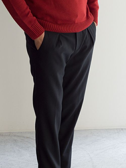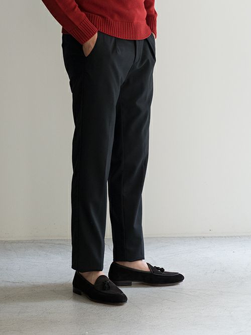 ウール混生地にストレッチ素材を加えたラグジュアリーなイージーパンツです。ニットやレザーブルゾンなど様々なスタイリングに良く馴染み、使い勝手にも優れた一着。