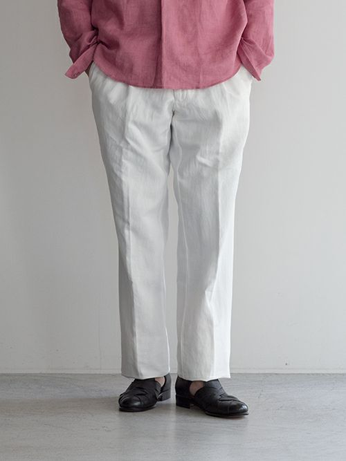 ワンタックで膝下からはストレートに近い、綺麗なシルエットのコットンリネンパンツ。ウエストの背面はゴム仕様で、フロントはドローコードを配しています。