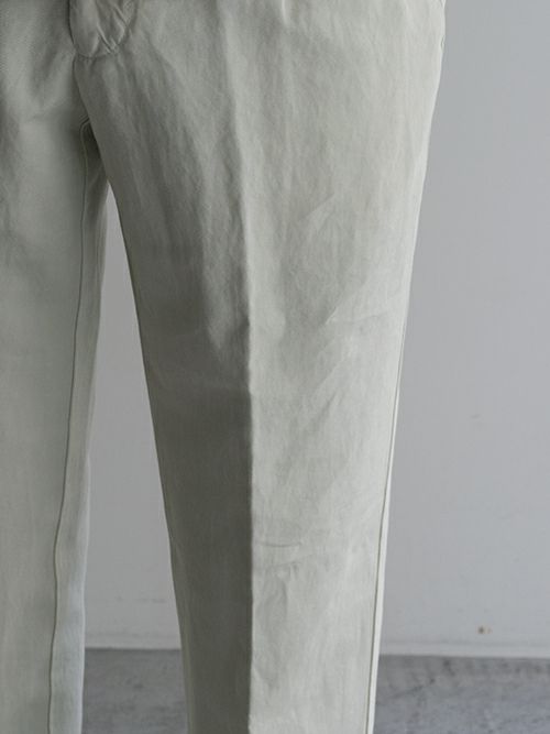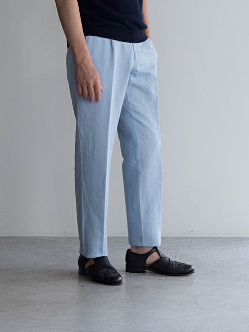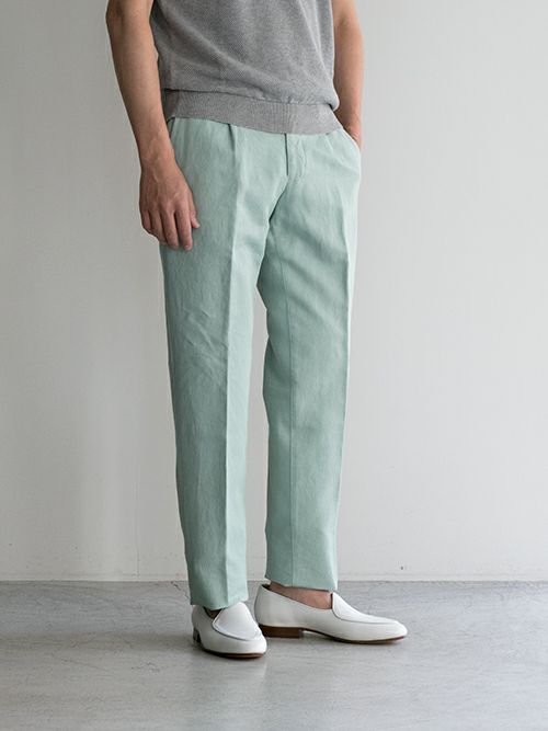 ワンプリーツで膝下から程よくテーパードさせた、イタリアブランドらしい綺麗なシルエットのコットンリネンパンツ。通気性が良く春夏シーズンに適しており、シャツをインした際の腰回りもスマートに見える一着です。
