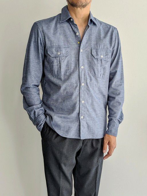 太めの前立てと両胸のフラップポケットが印象的なモデルALPHA。開きの抑えられたレギュラーカラーも魅力的です。