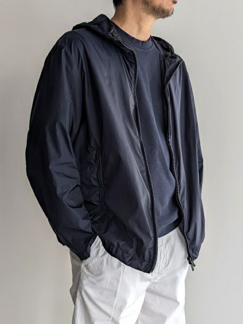 フード付きナイロンブルゾン「GUAGNANO」。上品で艶やかな生地は、スポーティーな印象に偏り過ぎず大人のカジュアルスタイルにフィットします。