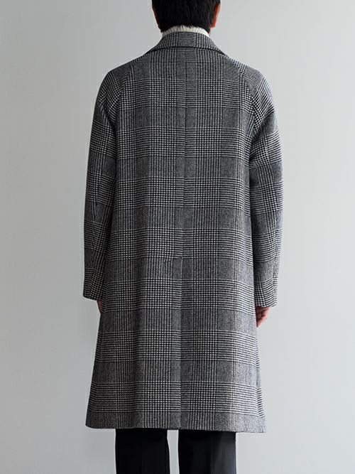 ウール、ナイロン混生地を使用したセミダブルコート「SURBO(スルボ)」。トレンドをおさえたゆとりのあるラグランスリーブのシルエットに、Hevoならではの独特なAラインとグレンチェック柄がモダンな雰囲気を生み出します。