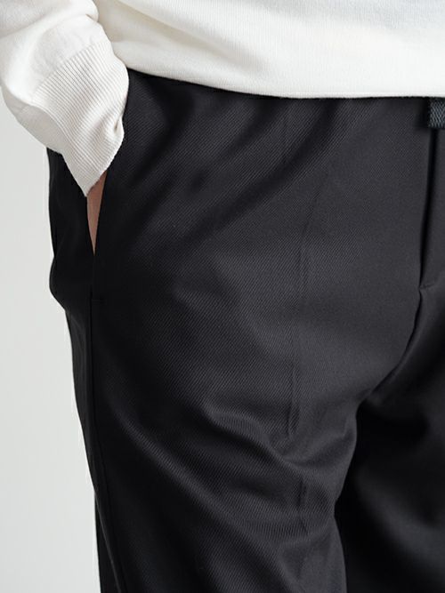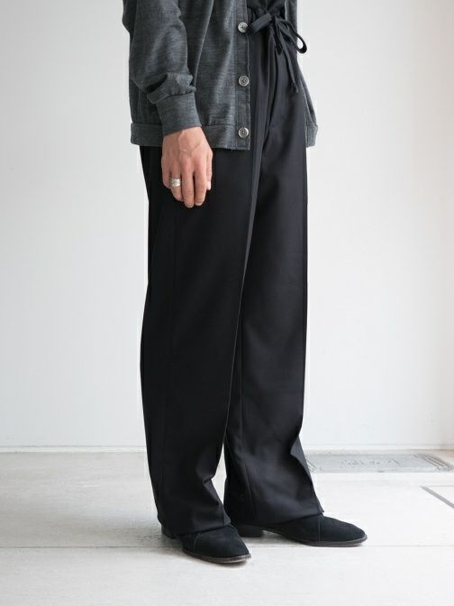 ゆとりのあるシルエットでリラックス感のあるイージーパンツ。ノータックですが、比較的股上が深いデザインでヒップには余裕を持たせています。