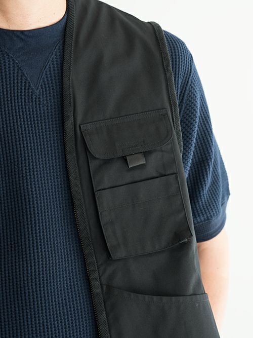 収納力抜群なポケットがフロント、バックに多数配置されており、男心をくすぐる機能性がそのままデザインの高さにつながったベスト。背面の大きなポケットはドローコード仕様です。
