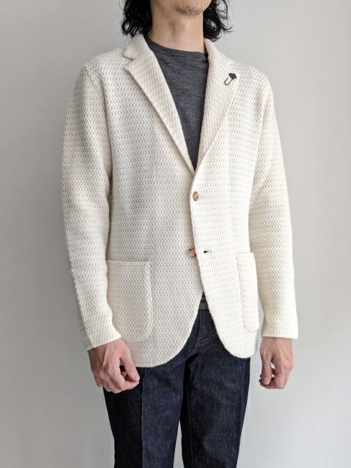 ノッチドラペルにフロントのパッチポケット、袖と背共に裏地はなしのカジュアルなデザイン。シンプルであるが故にカシミヤ100%の生地と、上質な仕立てが際立っており、ブランドアイコンでもあるブートニエールがその名の通り花を添えます。